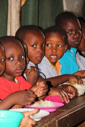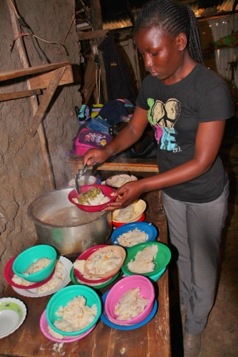 jeden Mittag ein warmes Mittagessen auf der Basis von Reis, Maismehl und
